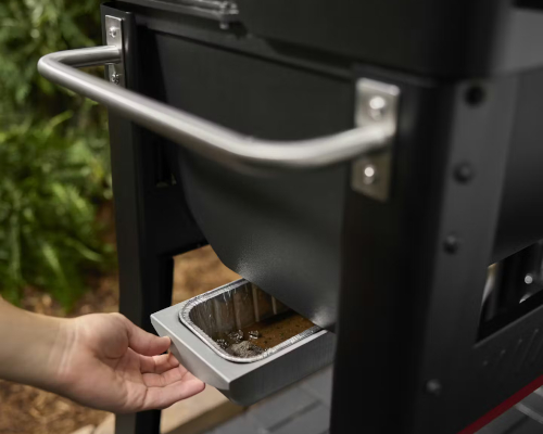 El sistema cerrado de gestión de grasa y cenizas permite mantener el ahumador limpio de forma rápida y sin complicaciones, sin necesidad de aspiradoras. Basta con cepillar o rascar los residuos hacia el colector y retirar el soporte con la bandeja de goteo desechable para eliminarlos cómodamente y sin esfuerzo.