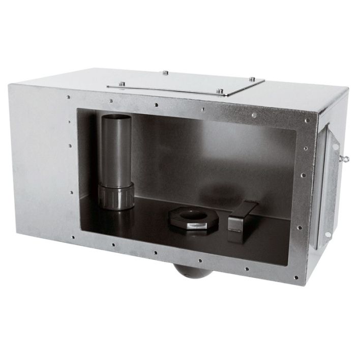 Inox. 18/8/2 AISI-316. Con rebosadero de Ø 50. Caja skimmer sin tapa telescópica. Dispone de alojamiento para montar válvula reguladora de nivel 00256. Con conexión para toma equipotencial.