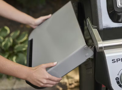 - Las mesas laterales antiarañazos ofrecen espacio extra para preparar alimentos y utensilios, y la mesa derecha plegable permite adaptar la barbacoa a espacios más reducidos.