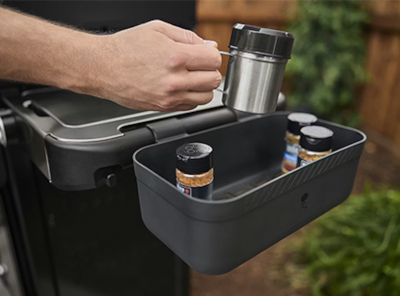 Los raíles laterales Weber Works permiten incorporar accesorios acoplables (a la venta por separado), como soportes para botellas, ganchos portautensilios adicionales o una lámpara flexible, ayudando a mantener la mesa lateral despejada y optimizando el espacio para preparar y servir con mayor comodidad.