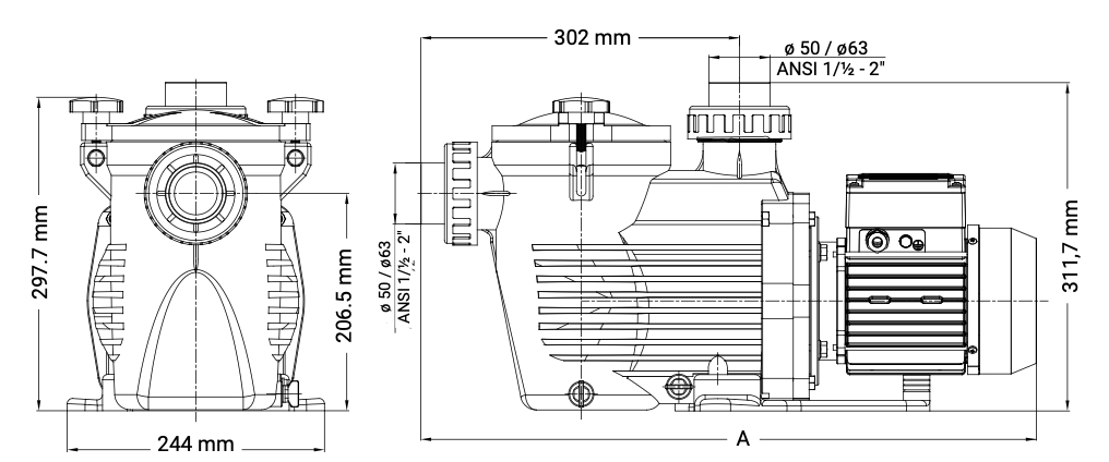 - Fácil instalación, bomba suministrada con conexiones de 50 o 63 mm.