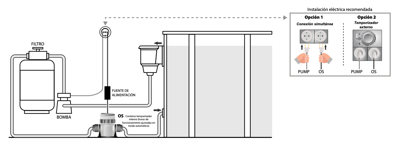 El sistema se coloca a continuación del equipo de filtración y opera de forma coordinada con la bomba de la piscina, pudiendo conectarse de manera conjunta o gestionarse mediante un temporizador externo. Además, incorpora un temporizador interno que facilita la programación automática de los ciclos de funcionamiento, adaptándose de forma sencilla a las necesidades reales de la piscina y al uso diario.
