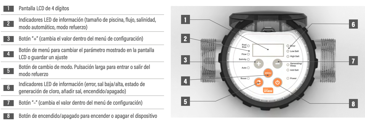 La interfaz del Clorador Salino Aquasphere OS ha sido diseñada para ofrecer un control sencillo, intuitivo y totalmente visual del sistema de cloración. En el centro del equipo se encuentra una pantalla LCD de 4 dígitos, desde la que se pueden consultar y ajustar los principales parámetros de funcionamiento de forma rápida y clara.