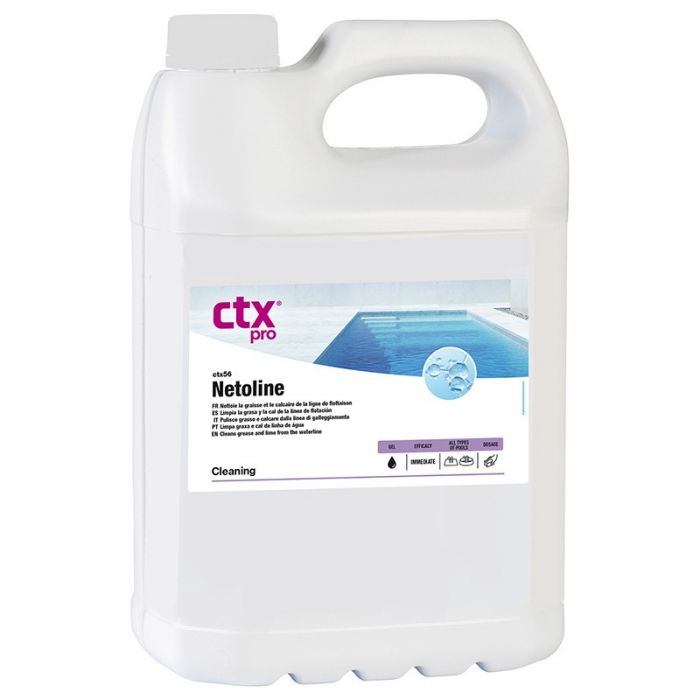 El CTX-56 Netoline es un compuesto detergente de carácter ácido especialmente formulado para eliminar los cercos de grasa, suciedad e incrustaciones calcáreas en los bordes y paredes de las piscinas y zonas anexas a las mismas que lo requieran, siempre con la garantía CTX Professional.