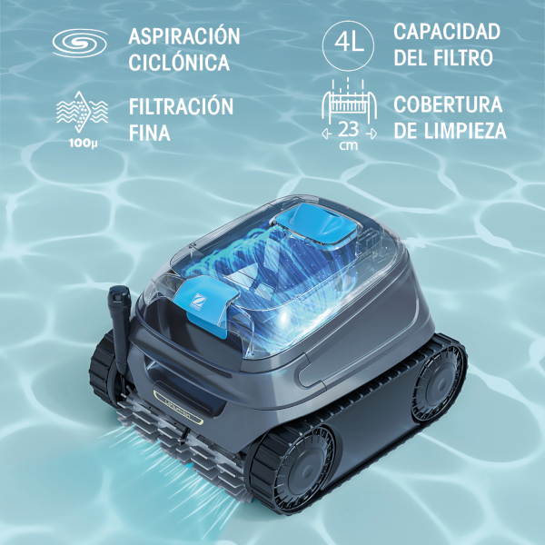 Su filtro de gran capacidad de 4 litros permite recoger una gran cantidad de suciedad sin necesidad de vaciados frecuentes, optimizando el rendimiento del robot. Además, su amplia cobertura de limpieza de 23 cm asegura un trabajo rápido y eficaz, permitiendo limpiar más superficie en menos tiempo y mantener la piscina en perfectas condiciones con el mínimo esfuerzo.