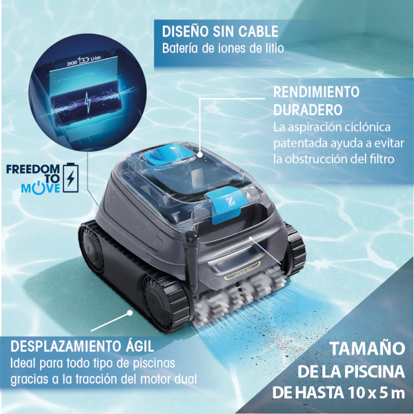 Destaca por su diseño totalmente inalámbrico, equipado con una batería de iones de litio que proporciona una gran autonomía y libertad de movimiento en la piscina. Gracias a su sistema de aspiración ciclónica patentada, mantiene una succión potente y constante, evitando la obstrucción del filtro y garantizando un rendimiento duradero durante todo el ciclo de limpieza.
