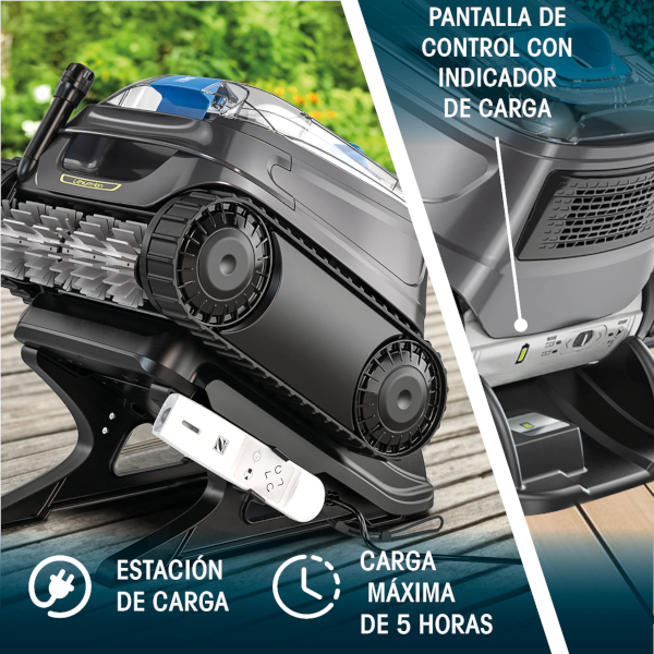 Con un tiempo máximo de carga de aproximadamente 5 horas, el robot recupera su autonomía para realizar una limpieza completa de la piscina. Todo el sistema está diseñado para ofrecer máxima comodidad, organización y facilidad de uso, manteniendo el limpiafondos siempre preparado para el siguiente ciclo de limpieza sin necesidad de cables ni instalaciones complicadas.