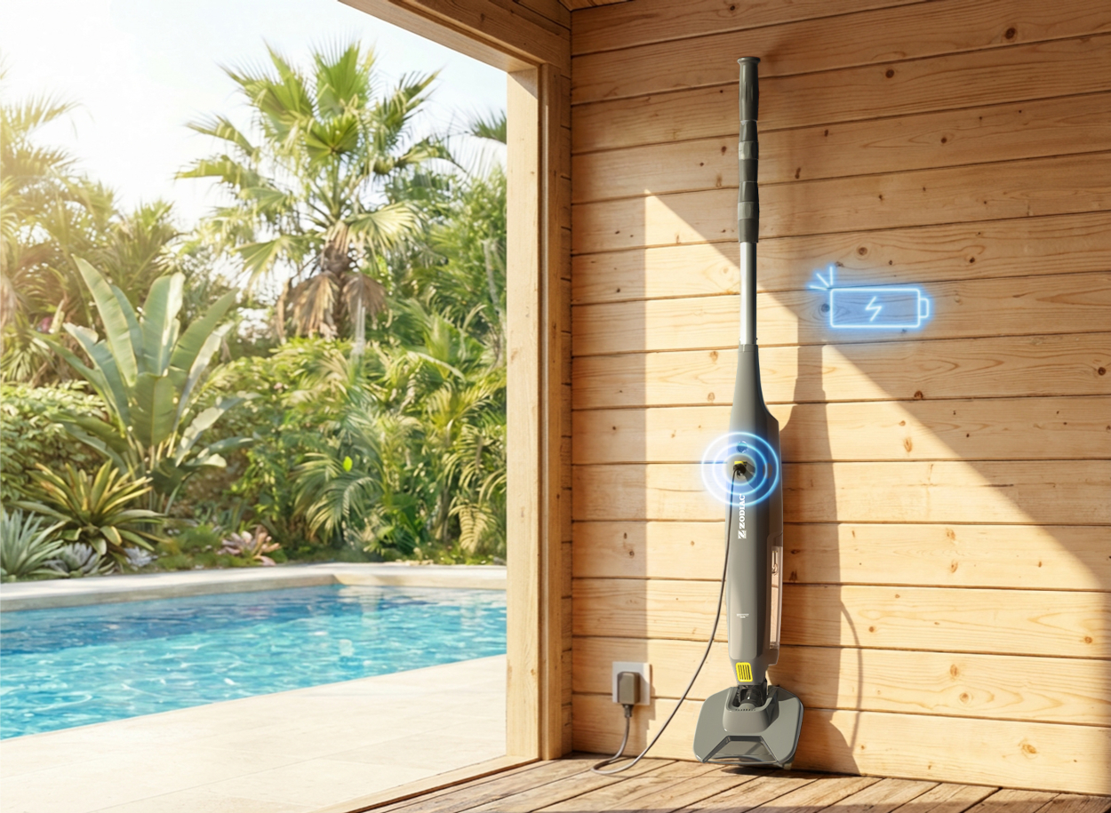 Su batería recargable de alto rendimiento permite disfrutar de una limpieza eficaz y silenciosa, mientras que el sistema de carga sencillo garantiza que la aspiradora esté siempre preparada para el próximo mantenimiento de la piscina. Un diseño pensado para ofrecer máxima comodidad y eficiencia en el cuidado diario del agua.